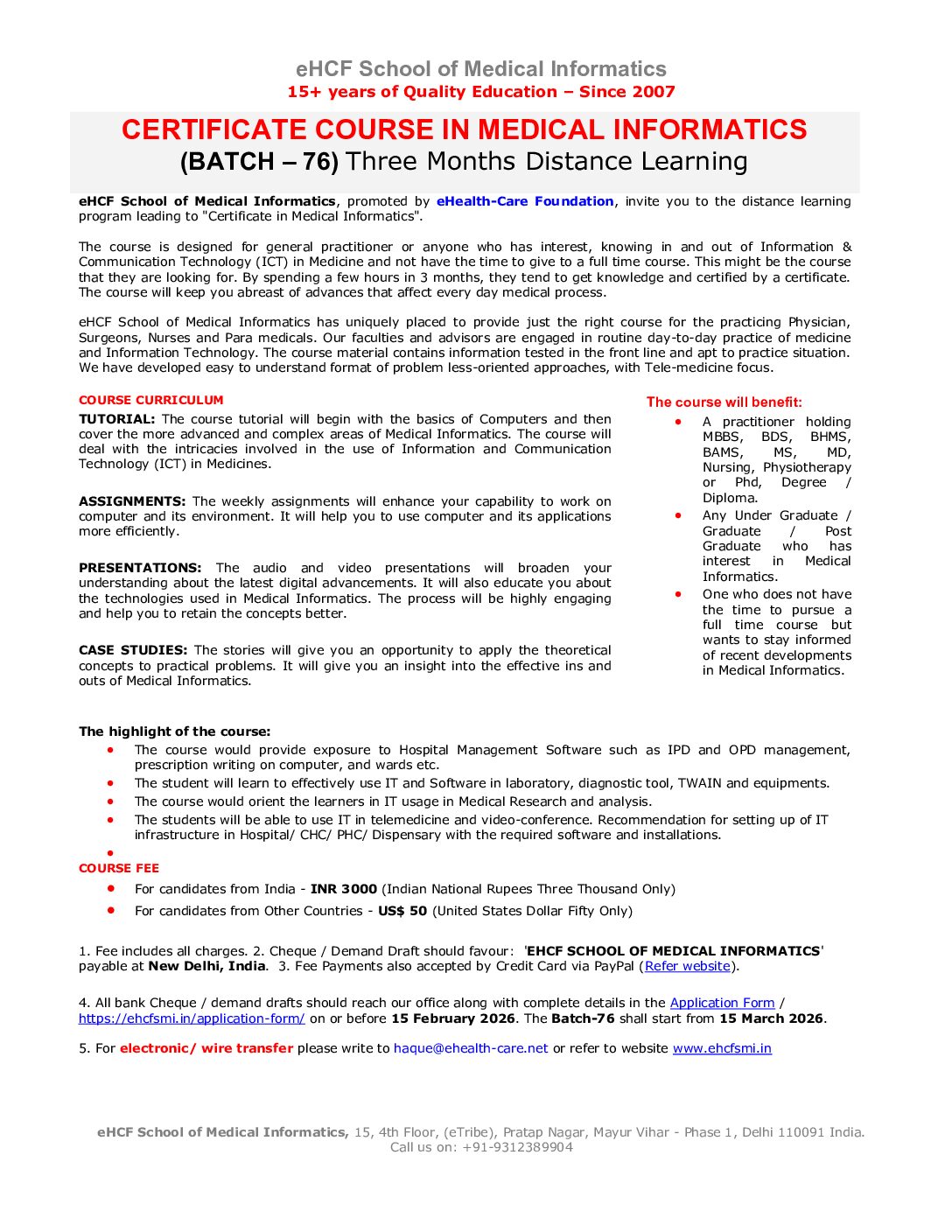 © 2007- 2025 eHCF School of Medical Informatics | eHealth-Care Foundation | M/s. eHealth-Care